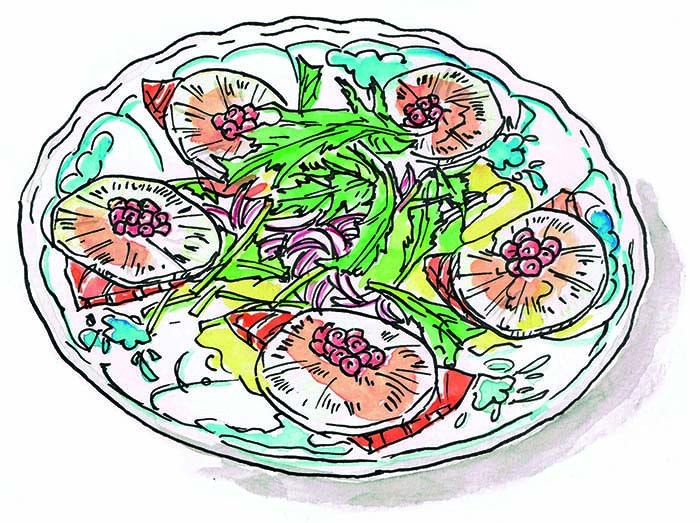「いくらサーモンと大根の親子カルパッチョ(599円(税抜))」は、大根のシャキシャキ感とサーモンの相性がバッチリ。上に乗ったいくらが、味のアクセントになっています。