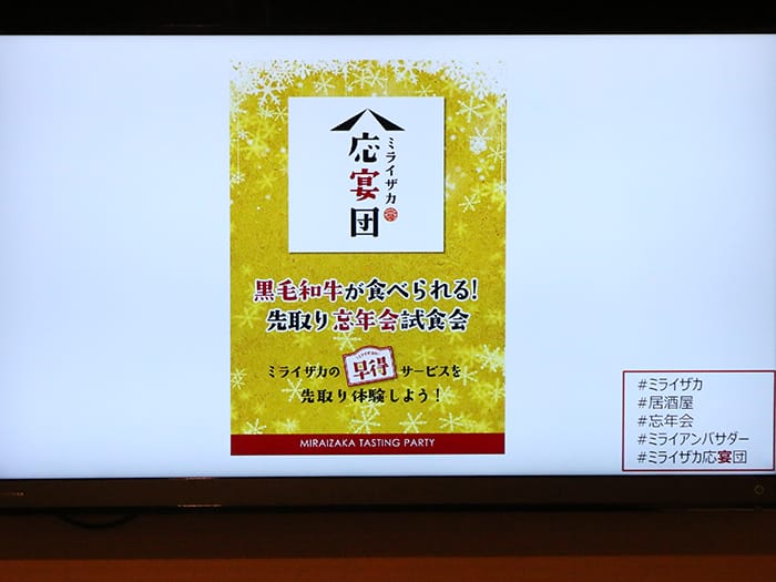 11月14日、東京都内の「ミライザカ」にて「ミライアンバサダー」限定企画第5弾、「ミライアンバサダー企画・黒毛和牛が食べられる!先取り忘年会試食会」が行われました。