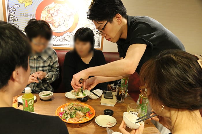 コースでは、「ミライザカ」名物の「清流若どり モモ一本グローブ揚げ」も楽しめます。スタッフが手際よく唐揚げを切り分けて。