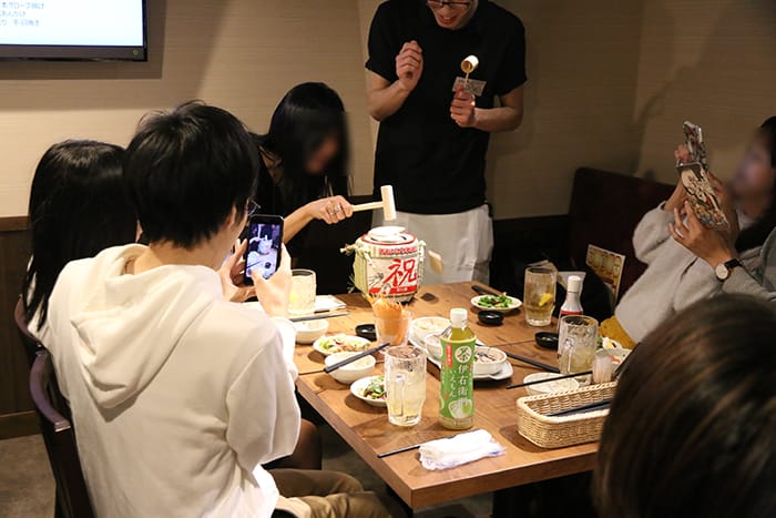 場が一段落したところで、今回の宴会コースと、11月30日までご予約いただくことで適用される「早得」サービスのご案内をいたしました。お鍋のグレードアップ以外にも、今回は「獺祭 等外」が飲めるプレミアム飲み放題へのグレードアップ、鏡割りセットを貸し出しする、といった特典があり、ミライアンバサダーの希望者の方に鏡割りを実際に行っていただきました。