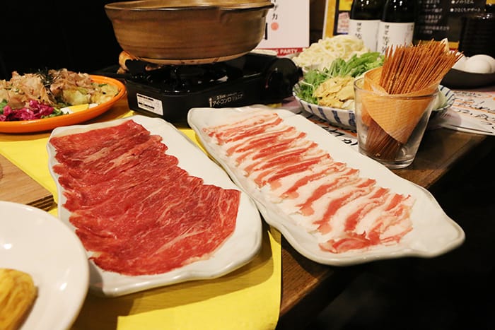 そしていよいよ、メインの「厳選 黒毛和牛と黒豚のすき鍋」が登場。スタッフがお鍋に野菜、お肉と、テンポよく入れていきます。