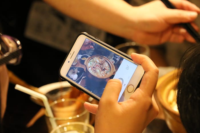 食べ頃になったお鍋を食べるみなさん。「おいしい!」という声が、いろいろなところから聞こえてきましたよ!もちろん、お鍋やお肉の撮影もばっちりです。