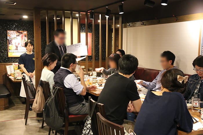 続いては、テーブルごとのグループワークへ。テーブルで相席されているみなさんは、顔見知りの方もいれば、初対面の方もいらっしゃいます。そこで、ゲームをすることでみなさんに親睦を深めていただきました。また、「みなさんが宴会の幹事になったら?」という設定で、「ミライザカ」へのご要望などもまとめていただきました。