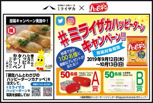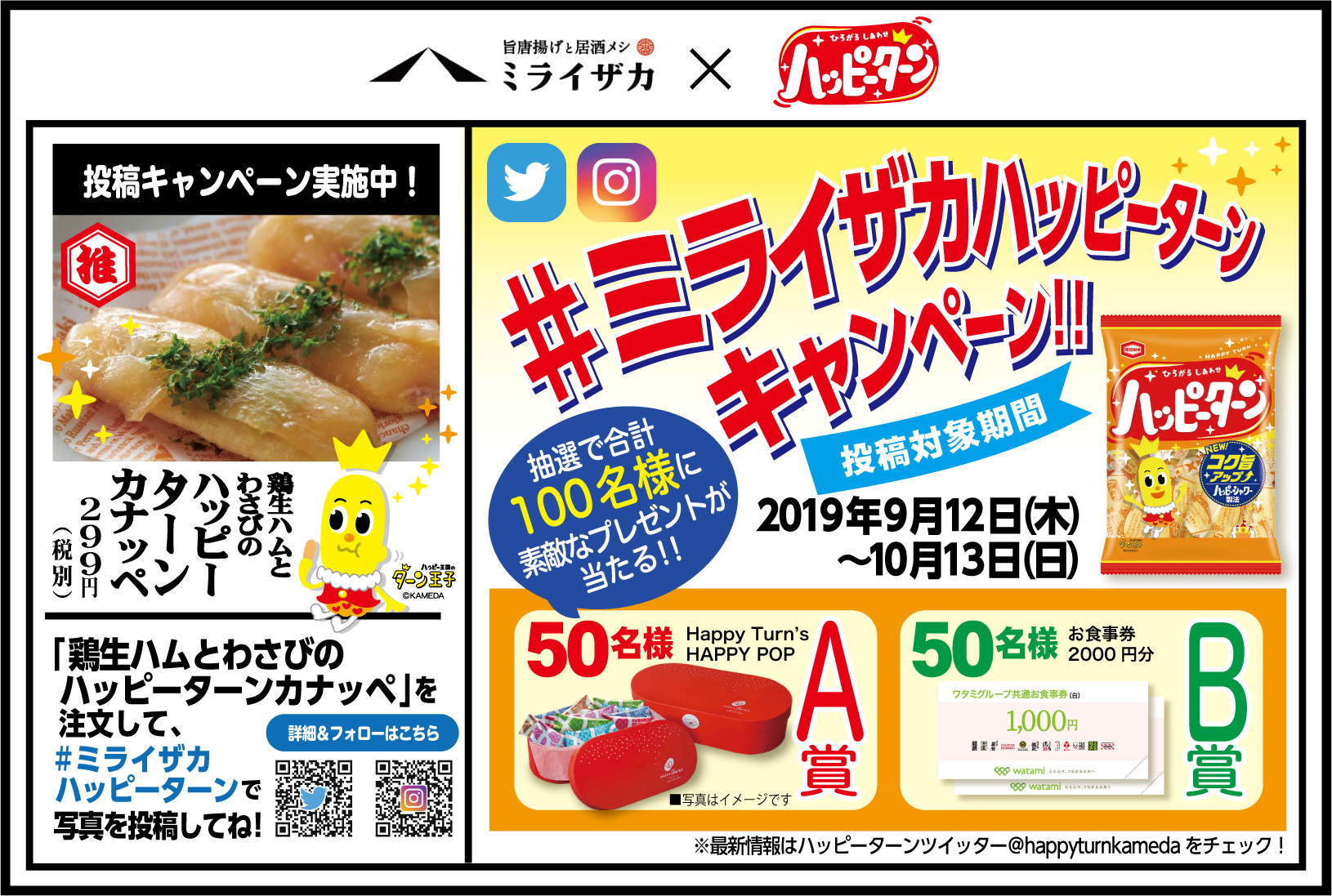 ●内容:ハッピーターンTwitter(@happyturnkameda)または亀田製菓Instagramアカウント(@kameda_jp)をフォローし、ミライザカのハッピーターンメニューをTwitterまたはInstagramで#ミライザカハッピーターンで投稿すると、抽選で合計100名様にプレゼント